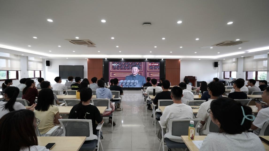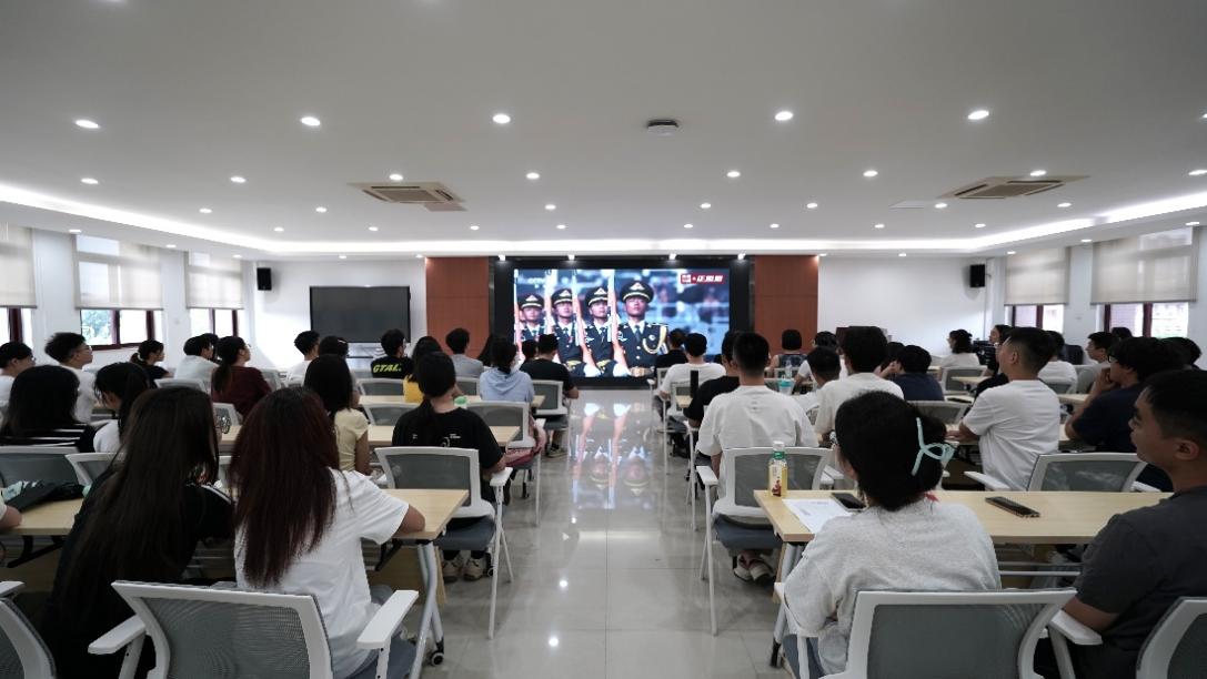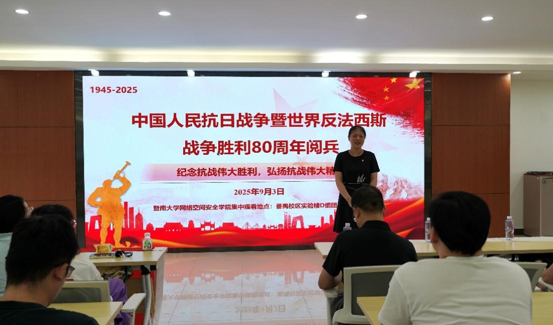 9月3日,纪念中国人民抗日战争暨世界反法西斯战争胜利80周年大会在北京天安门广场隆重举行,阅兵盛典同步直播。网络空间安全学院组织教师代表以及留校学生正式党员、预备党员、发展对象、入党积极分子等学生共计100余人在番禺校区实验楼D1-401会议室集中观看大会现场直播,共同见证国家荣光,凝聚奋进力量,开展爱国主义教育。