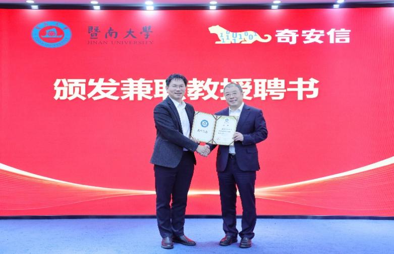 仪式上,暨南大学副校长翁健为奇安信专家颁发了兼职教授聘书。奇安信集团向学校捐赠一百万元人民币,设立“奇安信网络安全奖学金”,用于激励网络空间安全领域优秀学子。网络空间安全学院院长耿光刚代表学院致谢。