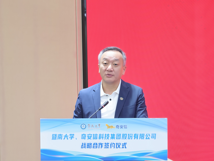 孙彧在致辞中表示,作为国家“双一流”建设高校和中央统战部直属高校,暨南大学在信息技术与网络安全领域拥有扎实的学科基础,设有网络空间安全一级学科博士点、全国首批博士后科研流动站及多个国家级、省部级科研平台。此次与网络安全领军企业奇安信集团开展深度合作,是学校服务国家网络安全战略、推动产学研用深度融合的重要举措,旨在共同探索粤港澳大湾区网络安全人才培养与技术创新融合发展的新路径。
